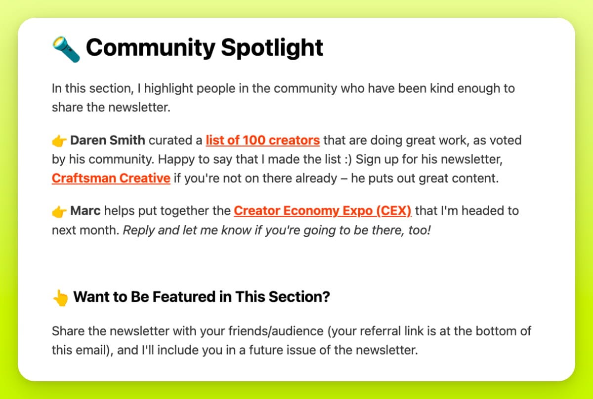 My referral program is centered around the section in my newsletter called the Community Spotlight. If you refer 10 people, I’ll give you a shout-out in that section. Each of those is now getting around 50-80 clicks every week, so they get a lot of value in return as well.